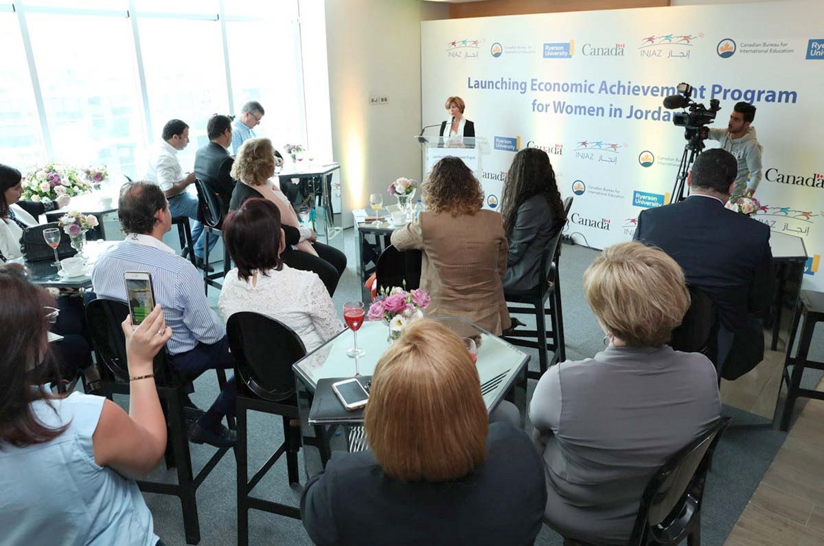 أطلقت مؤسسة إنجاز بالشراكة مع السفارة الكندية في عمان والمكتب الكندي للتعليم الدولي وجامعة رايرسون الكندية اليوم الاحد، مشروع دعم الفرص الاقتصاديّة للمرأة في الأردن الممول من الحكومة الكندية، والذي يهدف إلى تعزيز وتفعيل دور المرأة في عملية التنمية الاقتصادية، ونشر ثقافة تكافؤ الفرص بين الجنسين في مختلف المجالات، ومواجهة التحديات أمام المرأة في سوق العمل.