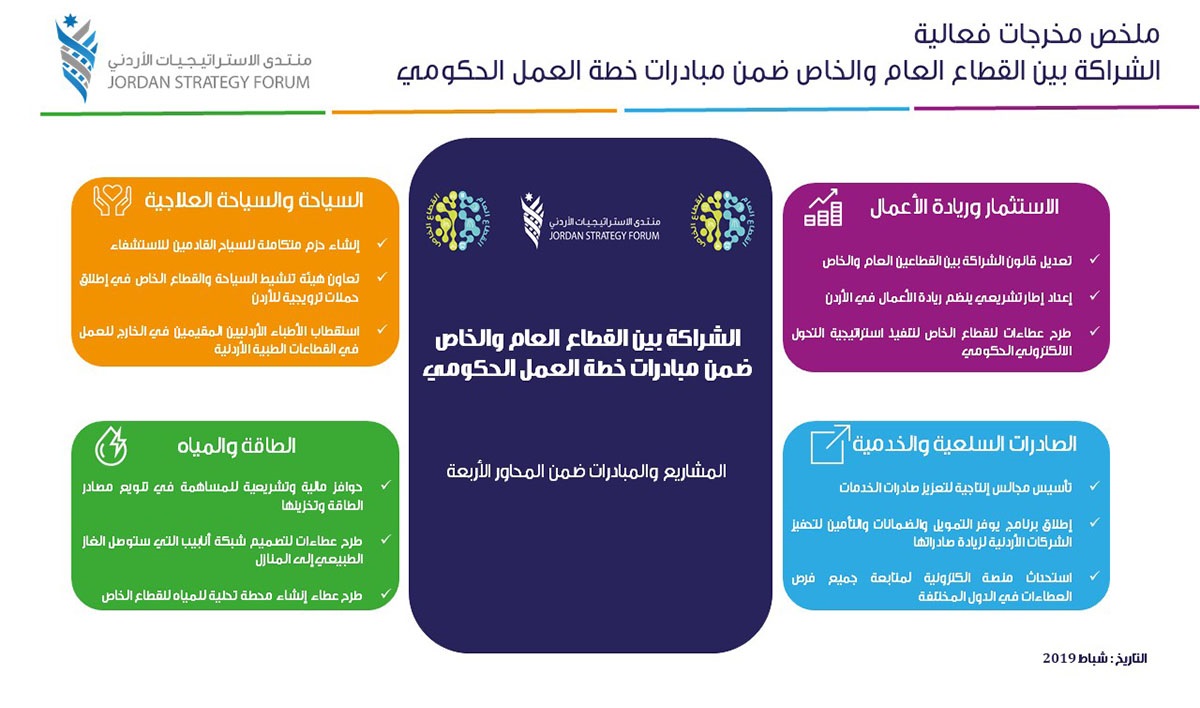 توافق مشاركون في جلسات حوارية، نظمها منتدى الاستراتيجيات الأردني أخيرا، بحضور رئيس الوزراء الدكتور عمر الرزاز، والفريق الاقتصادي، على تعديل قانون الشراكة بين القطاعين العام والخاص وتوسيع القطاعات المشمولة به، وكذلك توسعة نطاق مشاريع الشراكة لتشمل أخرى غير مشاريع البنية التحتية.